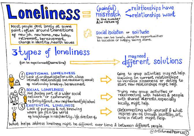 - The image below describes three different types of loneliness, which may need different solutions. By being clearer about what kind(s) of loneliness you’re experiencing you can see what the most helpful response might be.